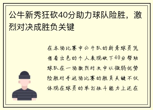 在本场比赛中,公牛队的新秀球员凭借着出色...