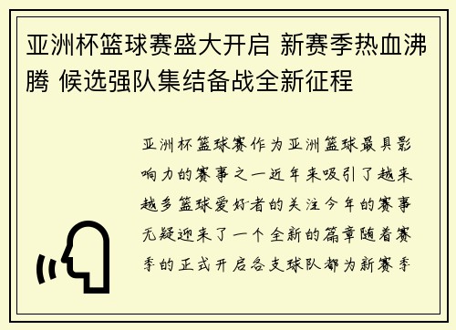 亚洲杯篮球赛作为亚洲篮球最具影响力的赛事...